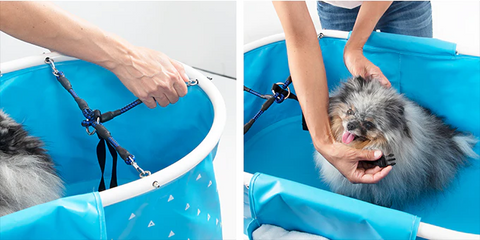 4. Place your pet in the tub and attach the safety harness